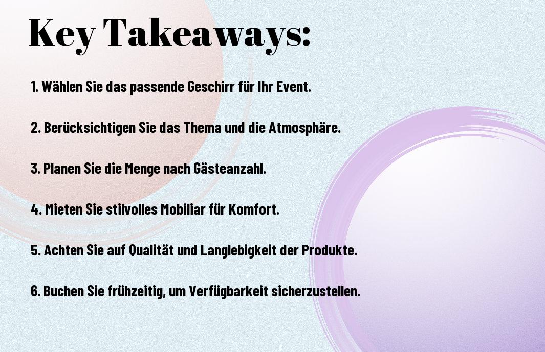 Um Ihr Event erfolgreich zu transformieren, sollten Sie die 10 wesentlichen Schritte zur Nutzung von Geschirrvermietung und Mobiliarverleih befolgen. Diese Schritte helfen Ihnen, eine kreative und funktionale Atmosphäre zu schaffen, die Ihre Gäste begeistern wird. Achten Sie darauf, hochwertige Materialien auszuwählen und auf die Details zu achten, um ein beeindruckendes Gesamtkonzept zu entwickeln. Mit der richtigen Planung und den passenden Mietdiensten können Sie Ihre Veranstaltung unvergesslich machen.