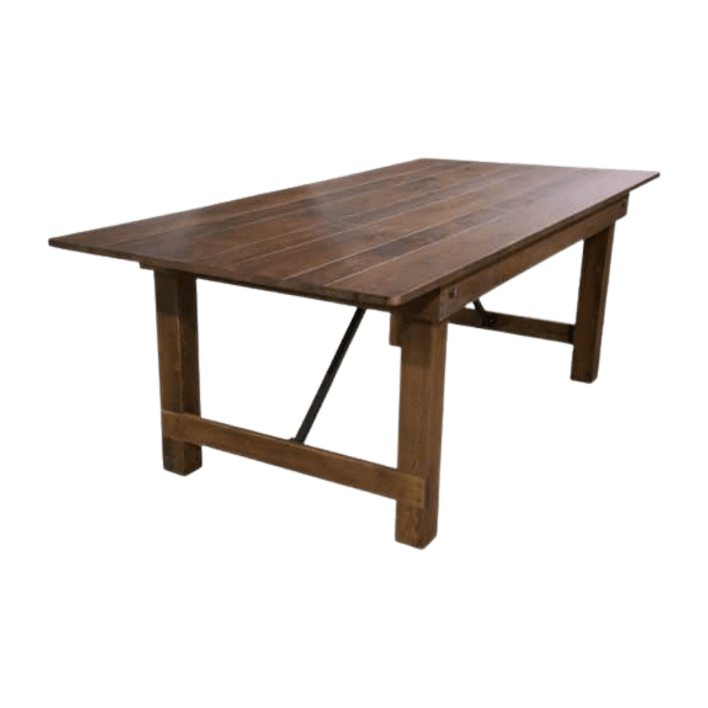 Unser Farmtable besticht durch seine grosszügigen Abmessungen von 243 cm Länge und 100 cm Breite. Mit einer Höhe von 72 cm bietet er nicht nur genügend Platz für bis zu acht Personen an den Längsseiten, sondern auch für zwei Personen an den Kopfenden. Dabei ist er nicht nur funktional, sondern auch ästhetisch ansprechend, und fügt sich harmonisch in jedes Veranstaltungsambiente ein.