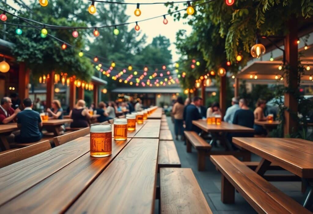 Ein wichtiger Aspekt ist auch, dass Outdoor-Elemente, wie beispielsweise Girlanden aus Lichtern oder Laternen, dem Raum eine warme, einladende Note verleihen. Schaffen Sie ein Gefühl von Zusammengehörigkeit, indem Sie die Tische und Bänke so anordnen, dass die Gäste sich wohlfühlen und einfach miteinander ins Gespräch kommen können. Ihre Biertische sollten in der typischen Biergarten-Manier aufgestellt werden, um den geselligen Charakter zu unterstützen.