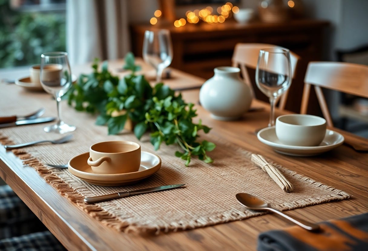 Achte darauf, dass die Dekorationselemente in unterschiedlichen Höhen und Texturen angeordnet sind, um dynamische Akzente zu setzen. Verwende zum Beispiel filigrane Gläser und robuste Holzuntersetzer. Jedes Element sollte die natürliche Ästhetik der Jute-Platzsets unterstützen und gleichzeitig deinem persönlichen Stil Ausdruck verleihen.