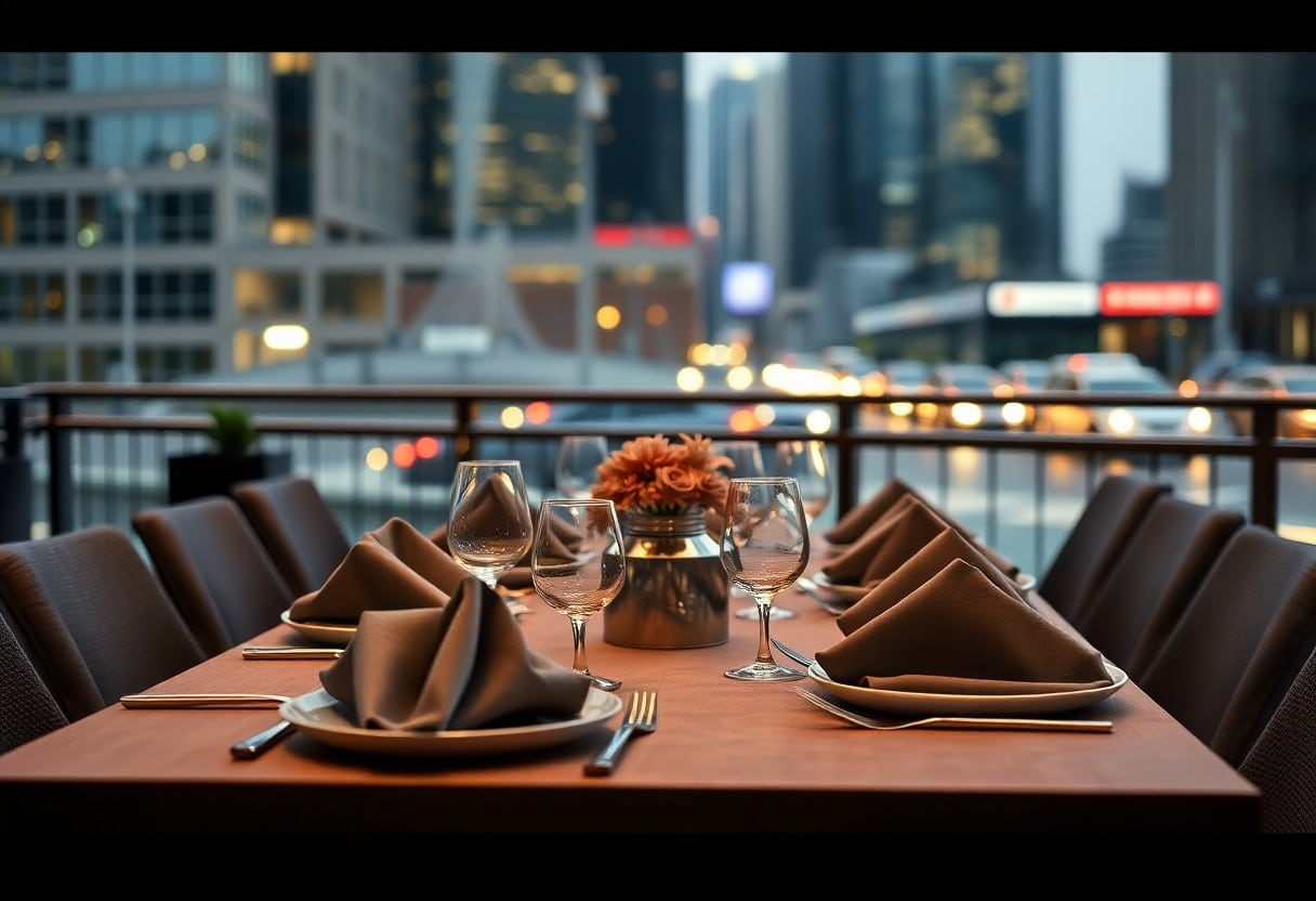 Verwenden Sie zum Beispiel Leinentischdecken in Staubgrau für eine lässige, aber raffinierte Ausstrahlung, während Samt in Kombination mit griffigen Geschirrtexturen gedämpfte Eleganz ausstrahlt. Sie können auch verschiedene Stoffe mischen, um visuelle und taktile Kontraste zu erzeugen, was Ihrem Dinner eine außergewöhnliche Note verleiht. Die Kombination der richtigen Materialien wird Ihr urbane Dinner zu einem unvergesslichen Erlebnis machen.