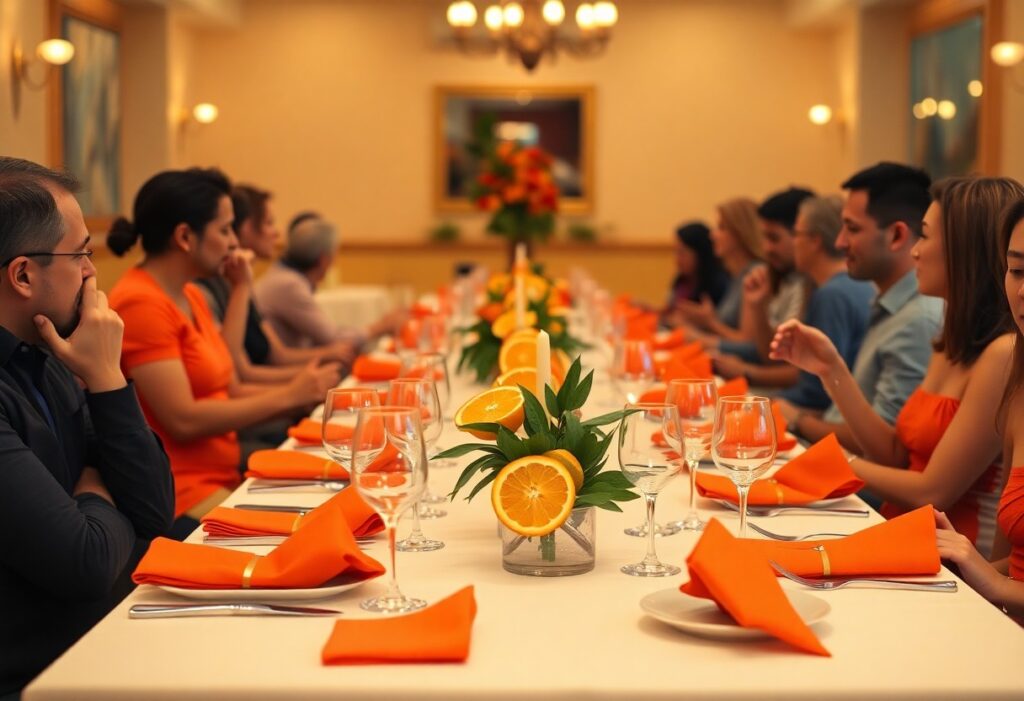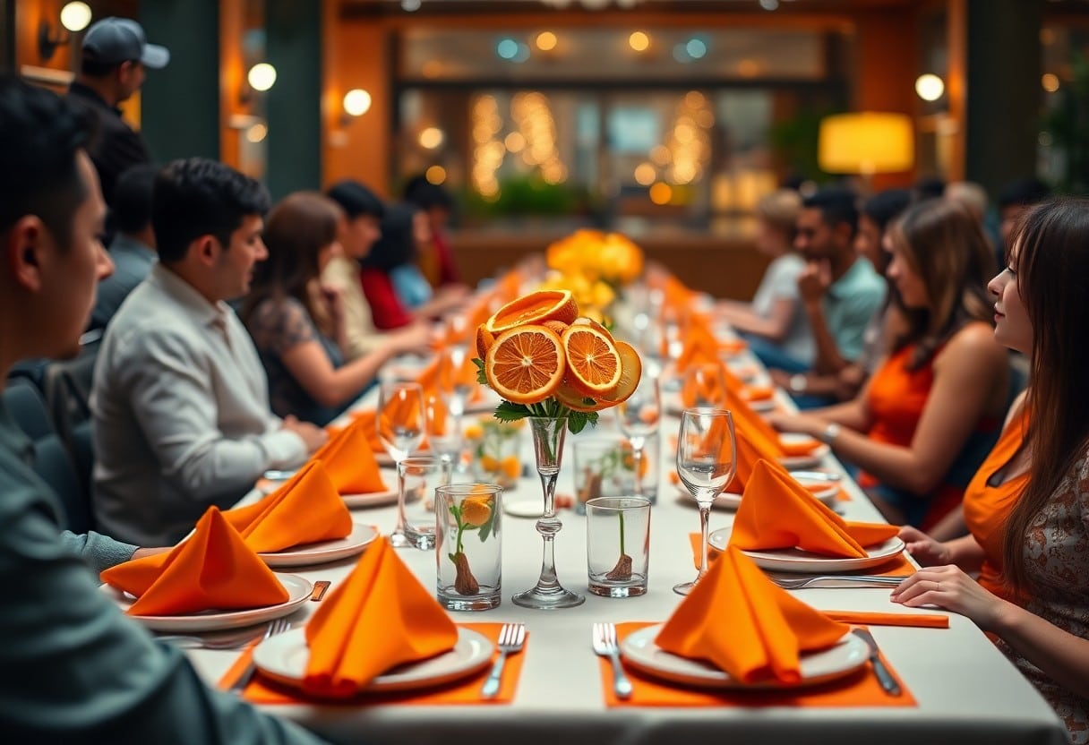 Darüber hinaus fördert Orange den Appetit. Studien zeigen, dass die Farbe das Verlangen nach Nahrung steigern kann, was besonders wichtig ist, wenn du Gäste bewirten möchtest. Eine warme, einladende Umgebung, die von Orange geprägt ist, kann dazu beitragen, dass deine Gäste mehr genießen und letztlich auch mehr essen. Die Einbeziehung dieser Farbe in die Dinner-Gestaltung ist also doppelt vorteilhaft: Sie hebt nicht nur die Stimmung, sondern schafft auch eine positive Assoziation mit dem Essen selbst.