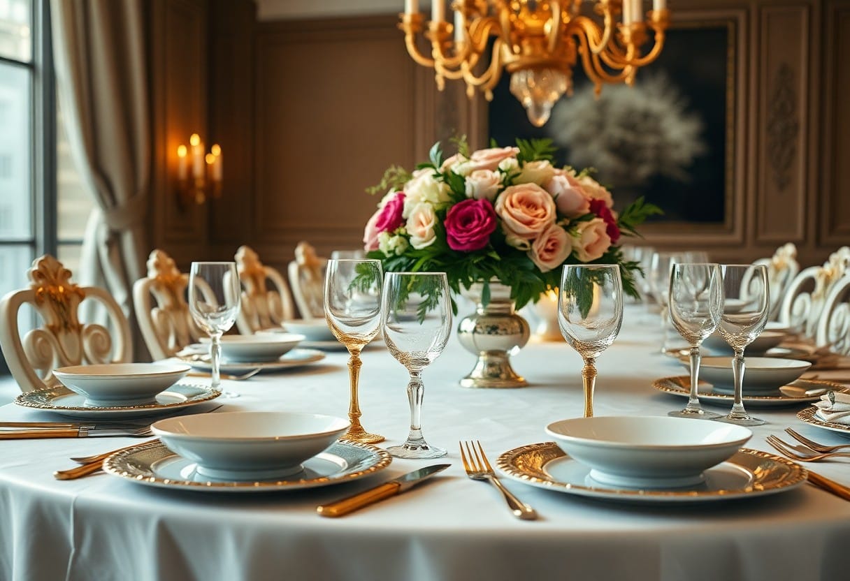Die Verwendung von goldenem Besteck kann das Gesamtbild Ihres Tisches erheblich aufwerten und eine einladende Atmosphäre schaffen. Beginnen Sie mit einer eleganten Tischdecke, die die goldenen Akzente des Bestecks hervorhebt. Wählen Sie Farben, die gut harmonieren, wie tiefes Rot, klassisches Schwarz oder sanftes Weiß. Achten Sie darauf, dass Ihr Besteck gut sichtbar ist – dies lässt den Tisch nicht nur edel erscheinen, sondern bringt auch einen Hauch von Opulenz in Ihr Dinner-Setting.