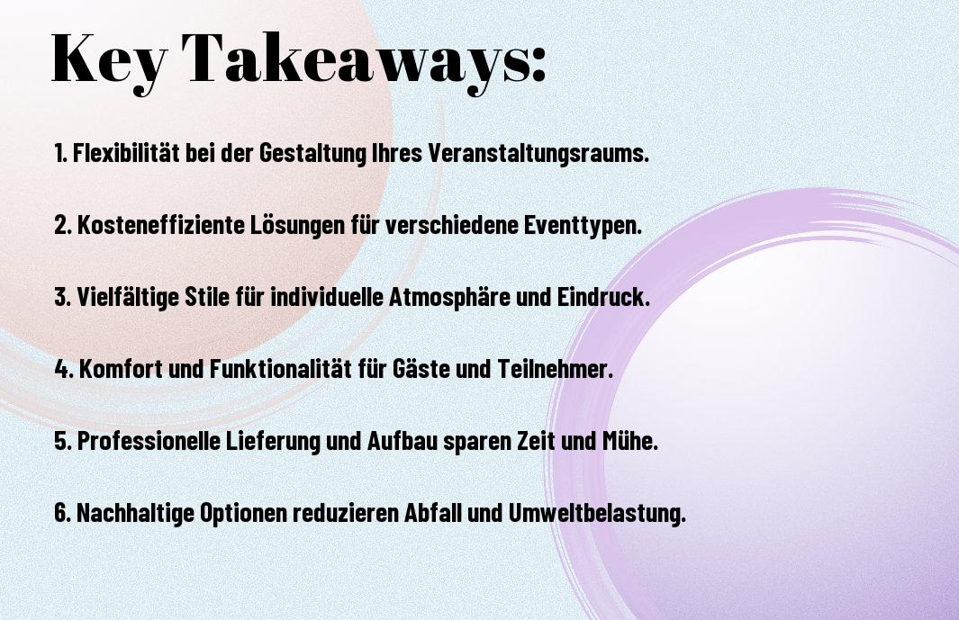 Um die Integrität der MietmĂśbel während Ihrer Veranstaltung sicherzustellen, sollten Sie eine sorgfältige Planung umsetzen. Achten Sie darauf, dass die MĂśbel ordnungsgemäss positioniert sind und vermeiden Sie Ăberlastungen. Eine klare Kommunikation mit Ihrem Team ist wichtig, um Schäden zu vermeiden, und regelmässige Kontrollen kĂśnnen helfen, mĂśgliche Probleme frĂźhzeitig zu erkennen.