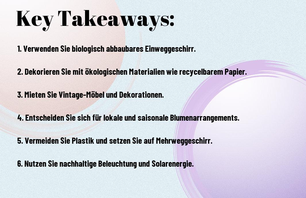 In unserem Blogbeitrag haben wir erkundet, welche nachhaltige Veranstaltungsausstattung sich für eine umweltbewusste Hochzeit in der Schweiz eignet. Während unserer Recherche konnten wir wichtige Erkenntnisse gewinnen, die zeigen, wie wichtig es ist, auf umweltfreundliche Alternativen bei der Eventplanung zu setzen. Wir haben festgestellt, dass recycelbare Dekorationen, biologisch abbaubares Geschirr und regionale und saisonale Zutaten eine grosse Rolle spielen, um eine nachhaltige Hochzeit zu realisieren.