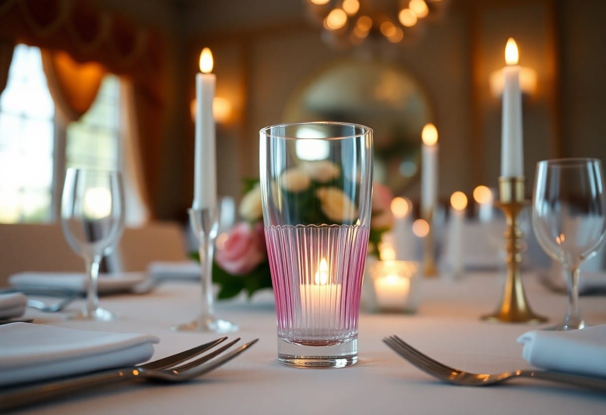 Lichteffekte sind entscheidend fßr die Stimmung bei einem romantischen Dinner. Setzen Sie Kerzen oder gedimmtes Licht ein, um eine intime und einladende Atmosphäre zu schaffen. Das zarte Licht des Wasserglases Stripe Rosa verstärkt den romantischen Charakter und lässt die Farben lebendig erscheinen.