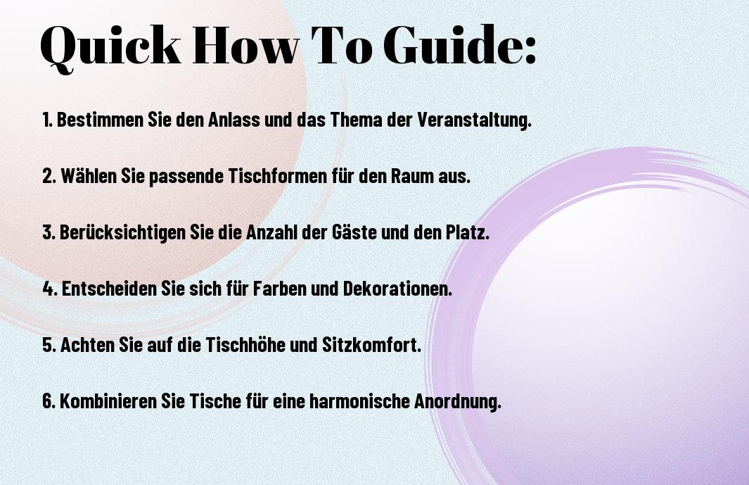 Um die ideale Atmosphäre fßr Ihre Veranstaltung zu schaffen, ist die Auswahl der richtigen Tische entscheidend. Berßcksichtigen Sie die RaumgrÜsse, das Thema und die Anzahl der Gäste, um die passenden TischgrÜssen und -formen zu wählen. Achten Sie auch auf das Design und die Anordnung, um ein harmonisches Gesamtbild zu erzeugen. Vergessen Sie nicht, Ihr persÜnliches Stilgefßhl einzubringen, um eine einladende und komfortable Umgebung zu schaffen, die Ihre Gäste begeistert. Mit diesen Tipps werden Ihre Veranstaltungen unvergesslich!